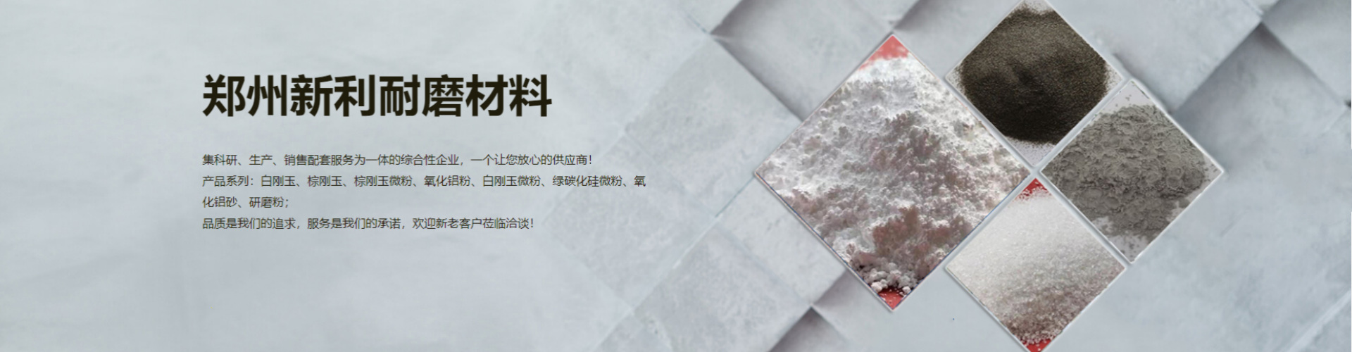鄭州新利耐磨材料有限公司主要產品:包含白剛玉砂、白剛玉微粉、棕剛玉、棕剛玉微粉、 綠碳化硅微粉、氧化鋁砂、氧化鋁粉、研磨粉等多系列產品,為客戶提供豐富的產品型號及加工定制服務...